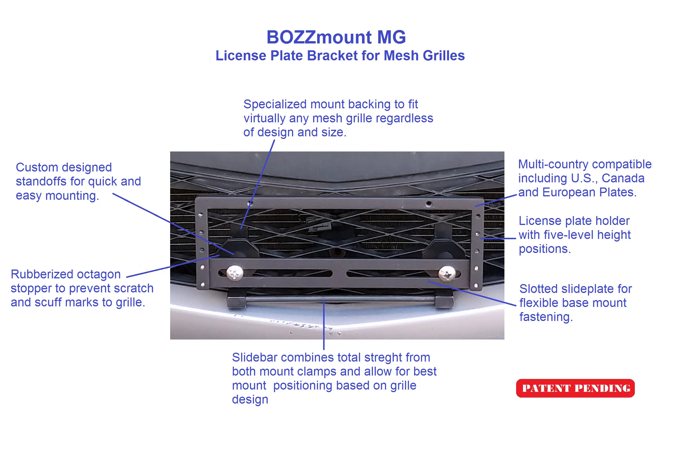 BOZZmounts are TRUE no-drill front license plate brackets. We use the term "TRUE No-drill" because you will never need to drill holes or modify your car, minivan, SUV or Pick-up truck in any way to install BOZZmounts.