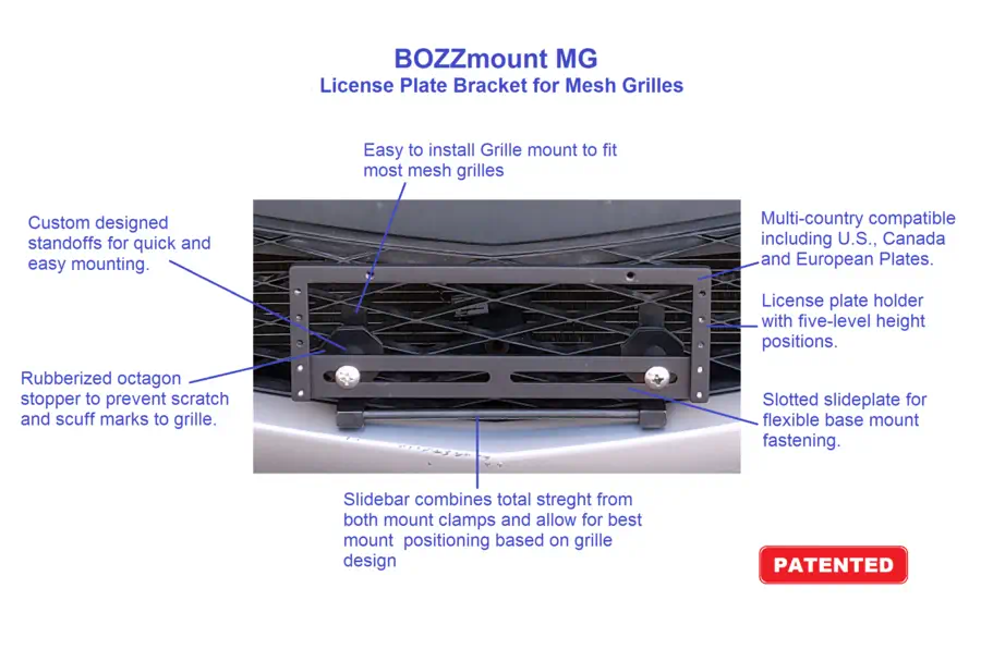 BOZZmounts are TRUE no-drill front license plate brackets. We use the term "TRUE No-drill" because you will never need to drill holes or modify your car, minivan, SUV or Pick-up truck in any way to install BOZZmounts.