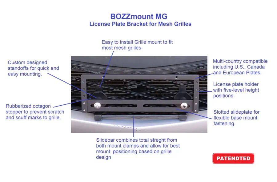 BOZZmounts are TRUE no-drill front license plate brackets. We use the term "TRUE No-drill" because you will never need to drill holes or modify your car, minivan, SUV or Pick-up truck in any way to install BOZZmounts.